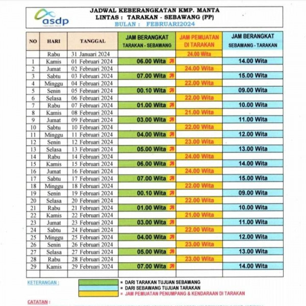 Jadwal Keberangkatan dan Tarif KMP Manta Lintas Tarakan Sebawang Bulan Februari 2024