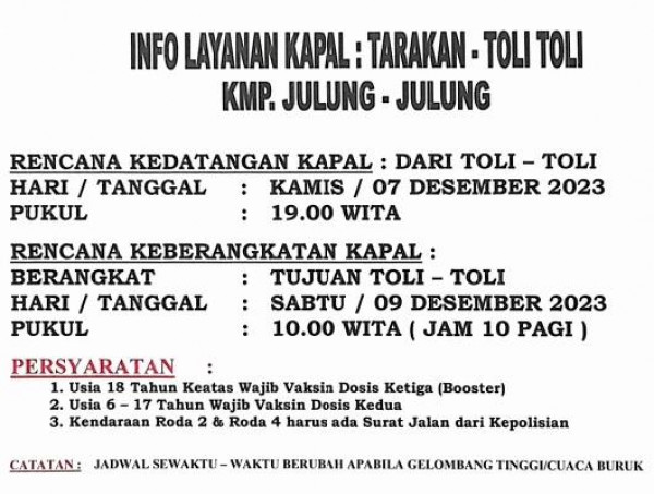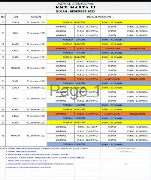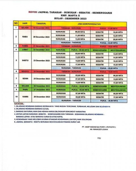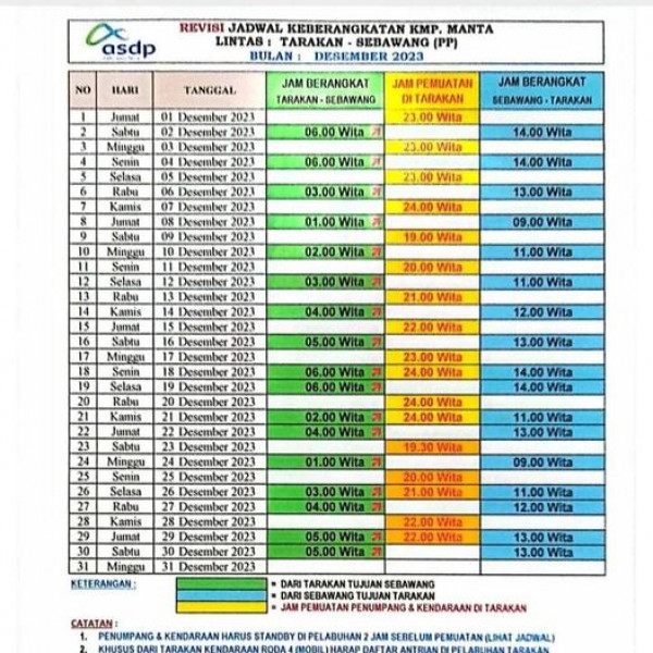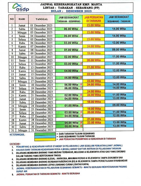 Jadwal Keberangkatan KMP MANTA Lintas Tarakan Sebawang PP Bulan Desember 2023Sumber Facebook : Uptd Pelabuhan Penyeberangan Juata