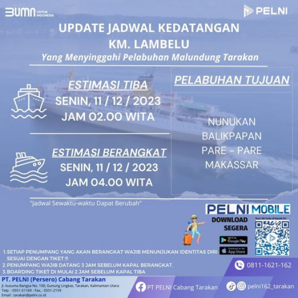 Jadwal Kedatangan dan Keberangkatan KM LAMBELU 11 Desember 2023PT PELNI Cabang Tarakan