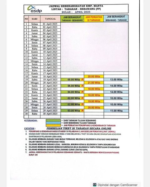 Jadwal Keberangkatan Kapal KMP Manta II Bulan Maret 2025Lintas Tarakan - Nunukan - Sebatik Sei MenggarisSumber FB : Uptd Pelabuhan Penyeberangan...