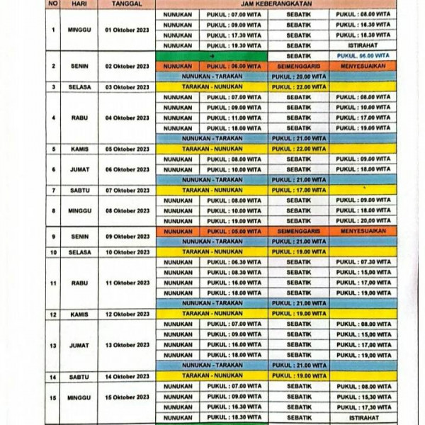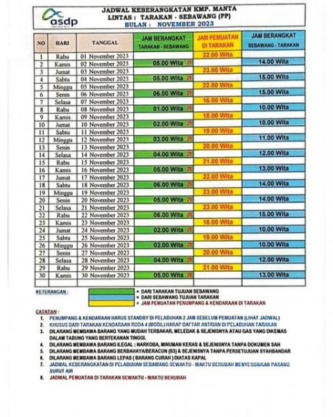 Jadwal Keberangkatan KMP. MANTA Lintas Tarakan - Sebawang Bulan November 2023JADWAL KEBERANGKATAN BULAN NOVEMBER LINTAS TARAKAN-SEBAWANG