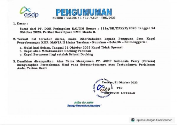 KMP MANTA II Lintas Tarakan - Nunukan - Sebatik - SeimenggarisMelaksanakan Docking Tahunan dan akan beroperasi lagi setelah selesai Docking.