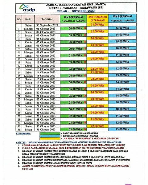 Jadwal Keberangkatan KMP. Manta Lintas Tarakan - Sebawang Bulan Oktober 2023
