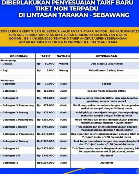 Tarif Baru KMP. Manta Lintas Tarakan - Sebawang Bulan Oktober 2023