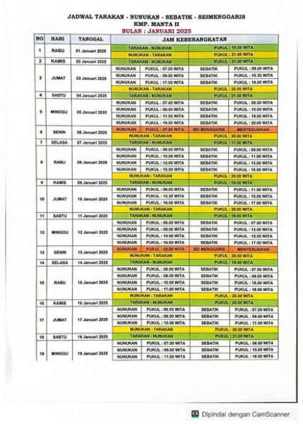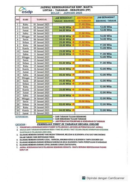 Jadwal Keberangkatan Kapal KMP Manta II Bulan Januari 2025Lintas Tarakan - Nunukan - Sebatik Sei MenggarisSumber FB : Uptd Pelabuhan Penyeberangan Jua...