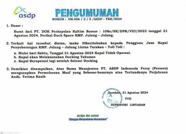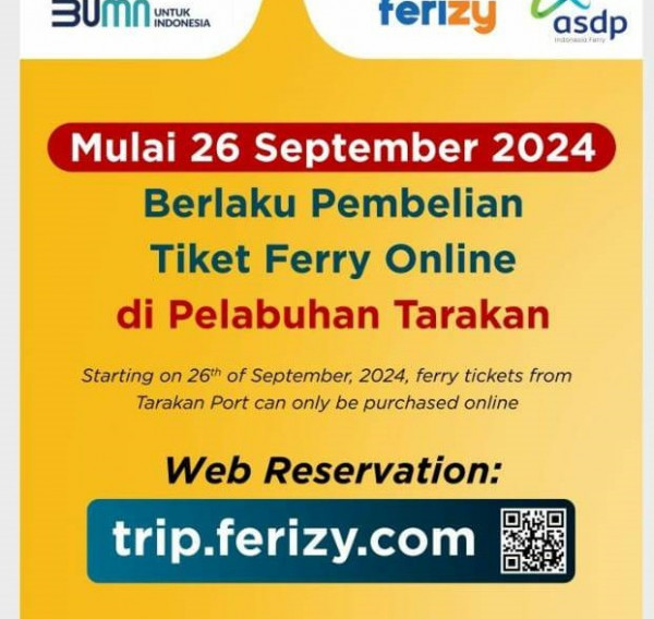 Pengumuman Mulai 26 September 2024 Berlaku Pembelian Tiket Ferry Online di Pelabuhan TarakanWeb Resevation : trip.ferizy.comTersedia Berbagai Metode P...